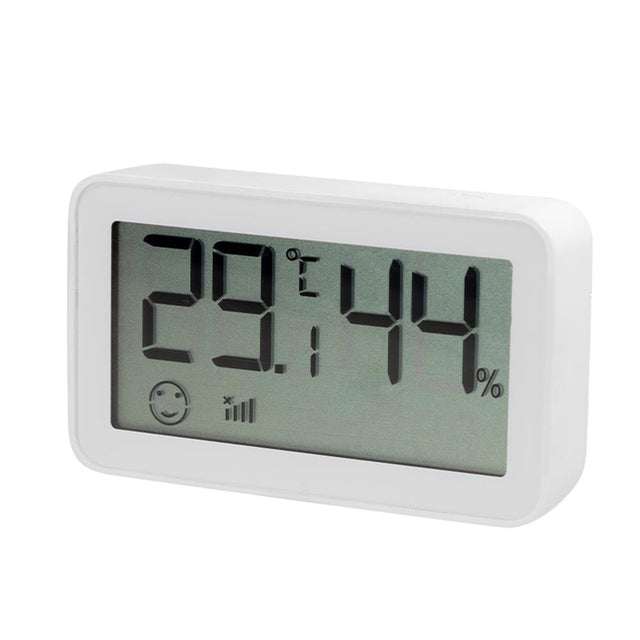 - LCD-Anzeige: Batteriestand, Wi-Fi-Signal, aktuelle Temperatur, aktuelle Luftfeuchtigkeit, Zeit, Temperaturstatus (Smiley-Gesicht/Weinendes Gesicht)