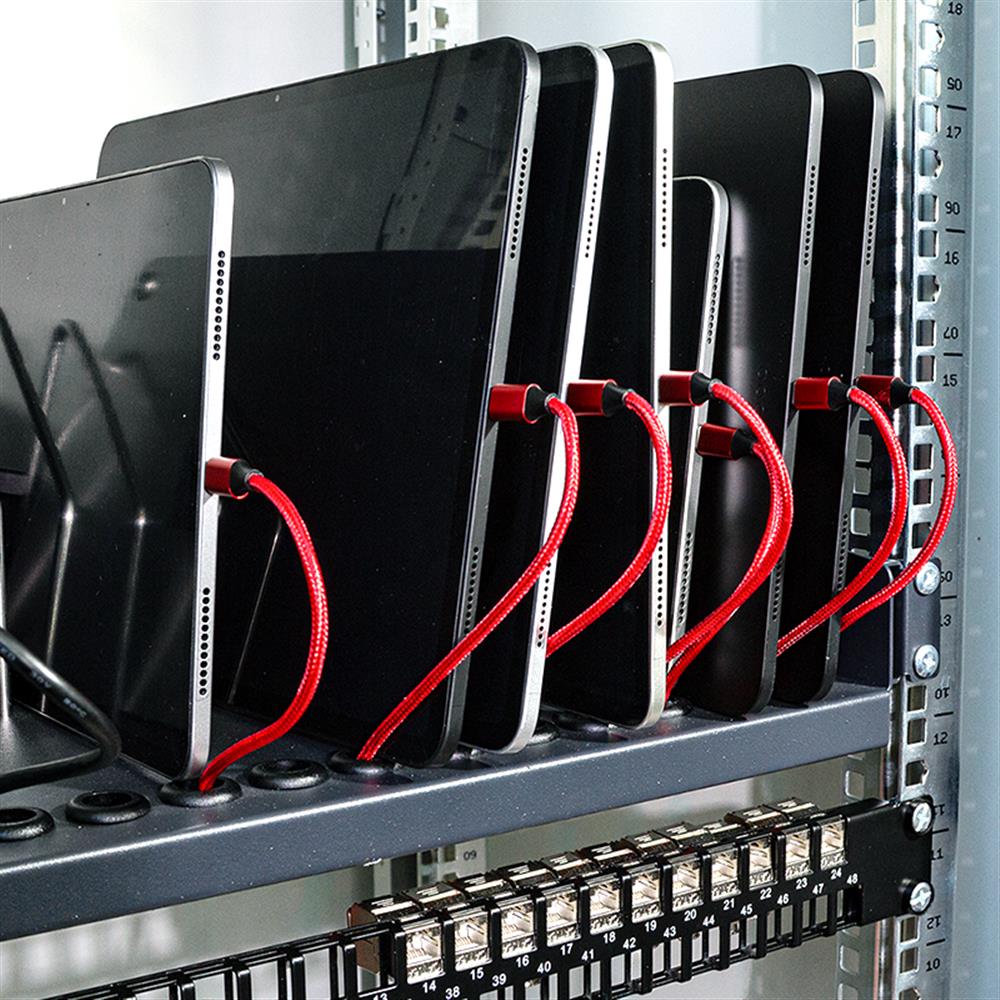 Der LogiLink ausziehbare 19"-Fachboden ist die perfekte Lösung für die sichere und platzsparende Unterbringung von mobilen Geräten wie Notebooks, Tablets und Smartphones in einem 19"-Schrank. Mit Platz für bis zu 14 Geräte und integrierten Öffnungen an der Vorderseite für Ladekabel sorgt er für eine optimale Organisation und einfaches Laden.